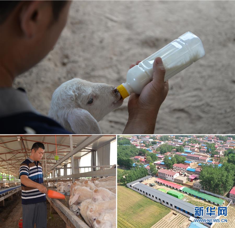 這是一張拼版照片(圖片均為5月16日攝)。上圖:在河南省開封市尉氏縣大橋鄉(xiāng)崗劉村,34歲的丁懿軍在給小羊喂奶;下左圖:丁懿軍在給羊喂食;下右圖:在扶貧政策扶持下,丁懿軍在村頭建了占地8畝的羊養(yǎng)殖場,現(xiàn)養(yǎng)羊800多只(無人機(jī)照片)。新華社記者孫清清攝