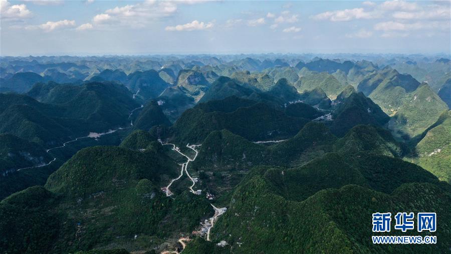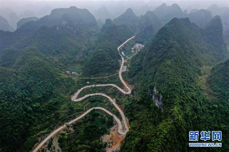 這是去年底通車的大化瑤族自治縣七百弄鄉(xiāng)江棟村那徐屯至弄獎屯公路(5月14日攝,無人機照片)。新華社記者曹祎銘攝