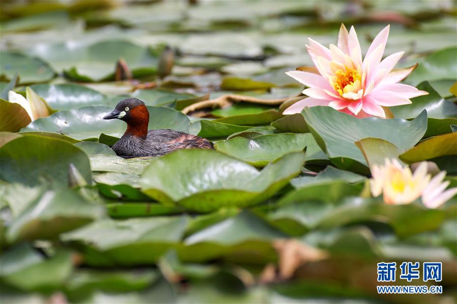5月22日,一只在蓮葉間游弋。近日,貴陽市觀山湖公園內(nèi)大片盛開的蓮花吸引了不少水鳥在其間嬉戲覓食。新華社記者劉續(xù)攝