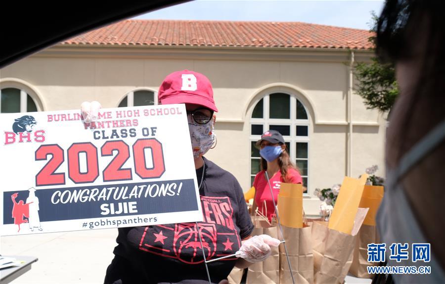 5月22日,在美國(guó)加州北部圣馬特奧縣,工作人員歡迎來(lái)辦理畢業(yè)手續(xù)的學(xué)生。新華社記者吳曉凌攝