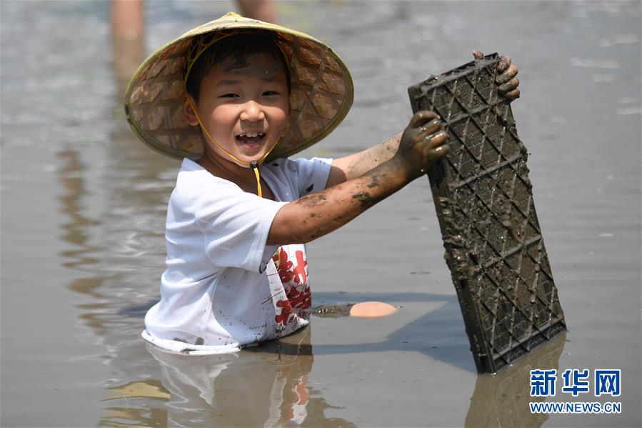 5月24日,一名小朋友在稻田里體驗(yàn)農(nóng)事。當(dāng)日,十余名小朋友在家長(zhǎng)的帶領(lǐng)下來(lái)到浙江省湖州市吳興區(qū)八里店鎮(zhèn)尹家圩糧油植保農(nóng)機(jī)專業(yè)合作社的稻田中,參加親子插秧、稻田捉魚(yú)等農(nóng)事體驗(yàn)活動(dòng)。新華社記者黃宗治攝