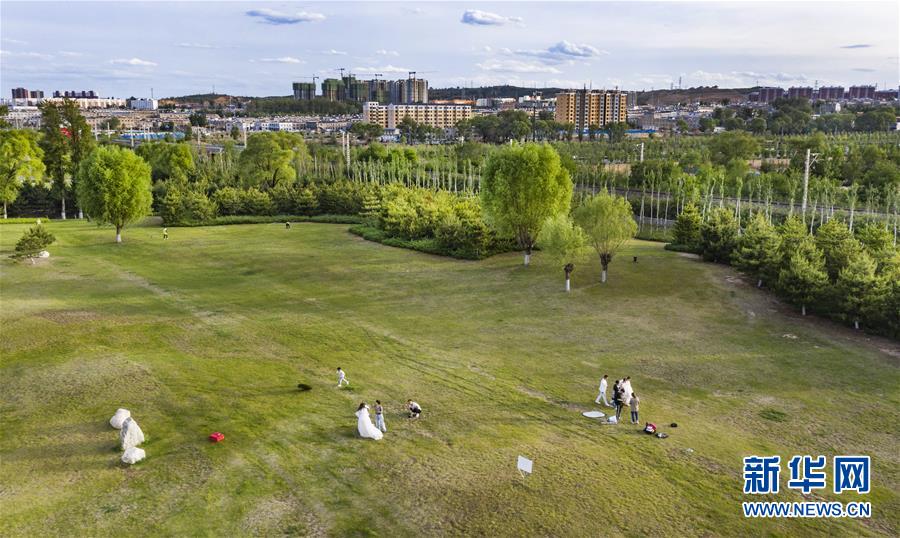 5月24日,市民在榆林市城市綠化帶拍攝婚紗照(無人機照片)。新華社記者陶明攝