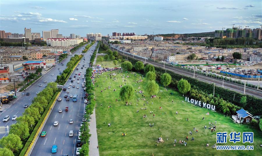 5月24日,市民在榆林市城市綠化帶休閑(無(wú)人機(jī)照片)。新華社記者陶明攝
