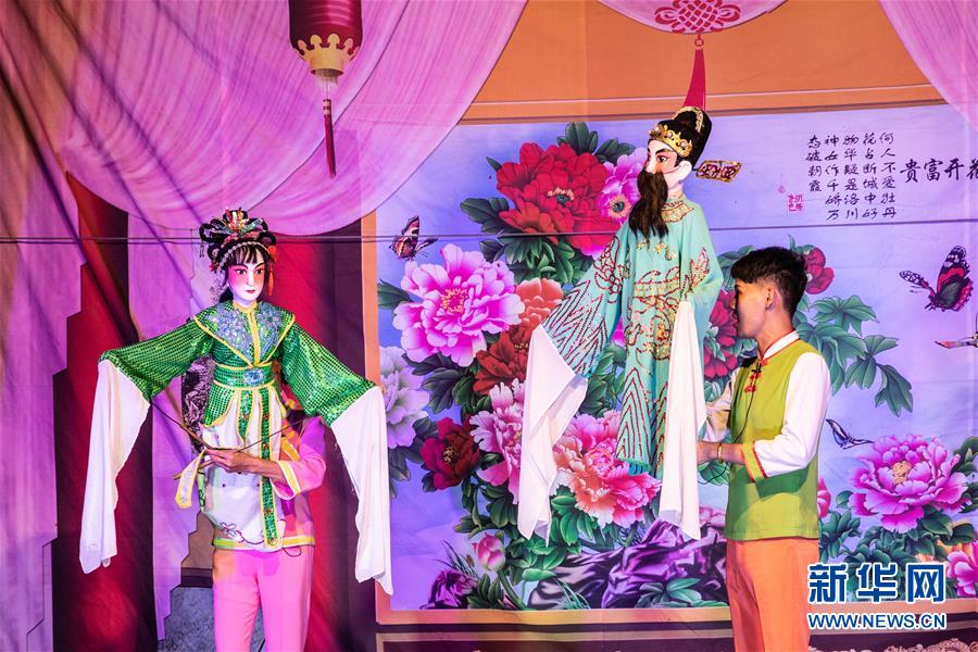 5月24日,海南臨高新風(fēng)人偶戲團的人偶在舞臺亮相。新華社記者張麗蕓攝