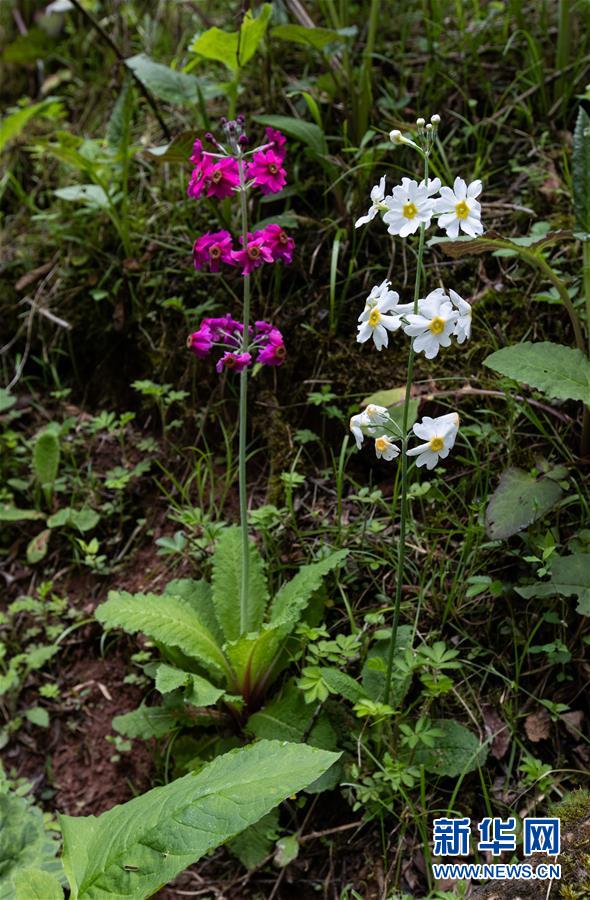 在四川省漢源縣桌子山,一株紅色的報春花旁生長著一株白色的報春花(5月24日攝)。新華社記者江宏景攝