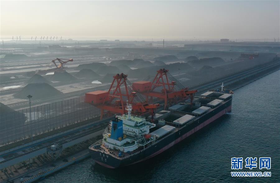5月22日,一艘輪船靠泊在唐山港曹妃甸港區(qū)煤碼頭三期工程的先期工程泊位裝貨(無人機照片)。新華社記者楊世堯攝