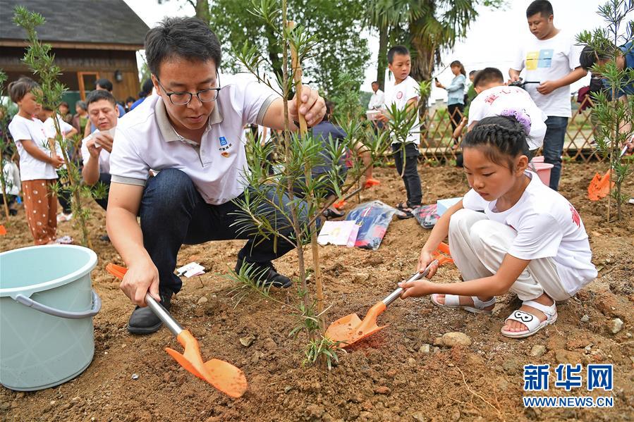 5月27日,在江西省貴溪市金屯鎮(zhèn)金屯村渡坊村小組,志愿者(左)和留守兒童一起種下“成長(zhǎng)樹(shù)”。