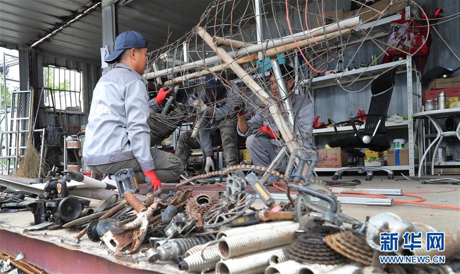 中轉(zhuǎn)服務(wù)站工棚地上堆滿分揀出來(lái)準(zhǔn)備制作工藝品的材料(5月27日攝)。新華社記者方喆攝=