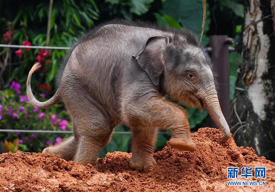 5月27日,廣州長隆的新生亞洲象寶寶在紅泥堆玩耍,這些泥土可以幫助大象護理皮膚和補充鹽分。新華社記者劉大偉攝
