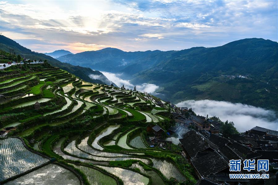 晨光中的從江縣加榜鄉(xiāng)加車梯田(5月28日攝)。夏日時(shí)節(jié),位于貴州省黔東南苗族侗族自治州從江縣加榜鄉(xiāng)加車、加頁(yè)、黨扭等苗寨的梯田在晨霧與陽(yáng)光的映襯下線條分明,光影變幻,景色如畫(huà)。新華社記者 楊文斌 攝