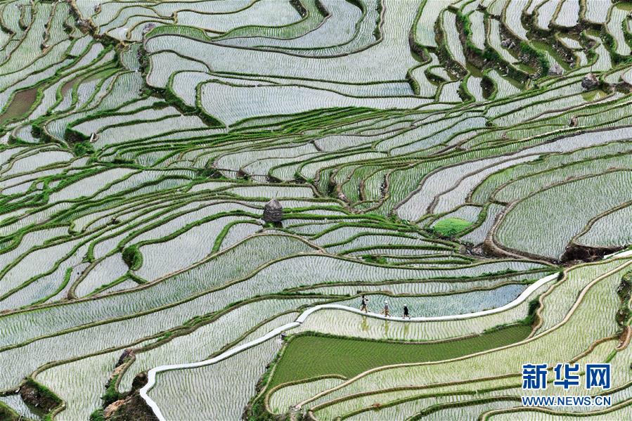 村民從從江縣加榜鄉(xiāng)黨扭梯田上經(jīng)過(guò)(5月26日攝)。夏日時(shí)節(jié),位于貴州省黔東南苗族侗族自治州從江縣加榜鄉(xiāng)加車、加頁(yè)、黨扭等苗寨的梯田在晨霧與陽(yáng)光的映襯下線條分明,光影變幻,景色如畫(huà)。新華社記者 楊文斌 攝