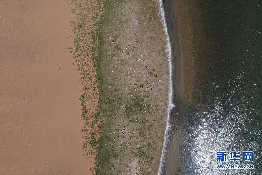 5月31日,羊群在巴丹吉林沙漠音德日?qǐng)D湖湖畔休憩(無(wú)人機(jī)照片)。新華社記者徐欽攝。