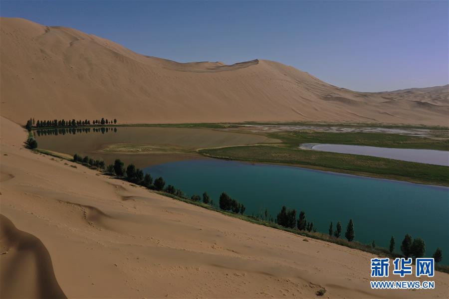這是5月30日拍攝的巴丹吉林沙漠一處湖泊(無人機(jī)照片)。新華社記者徐欽攝。
