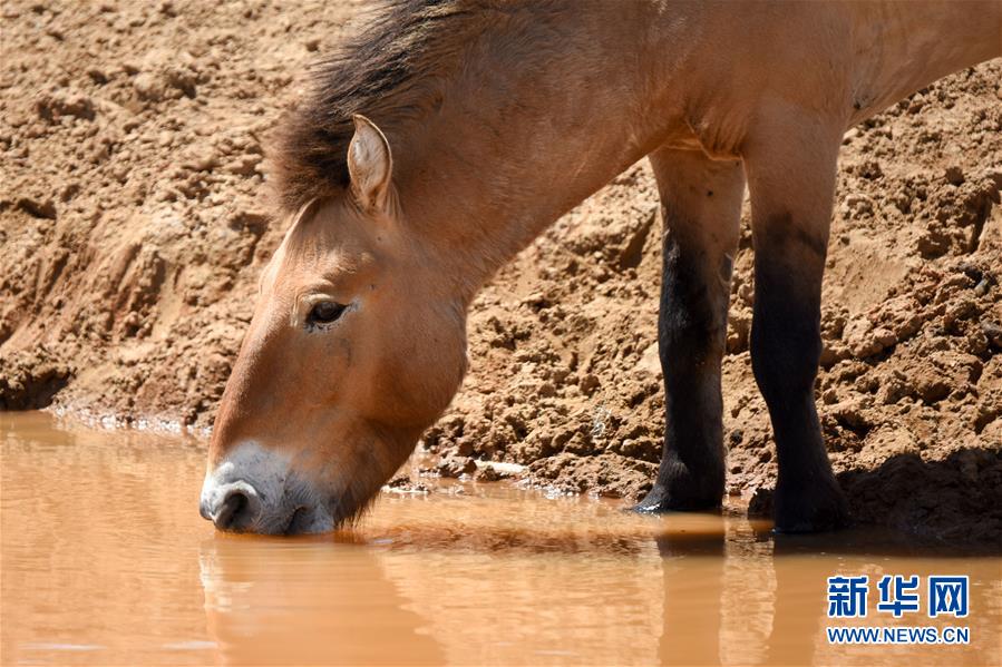 在新疆卡拉麥里山有蹄類野生動物自然保護區(qū),一匹普氏野馬在水源地飲水(6月3日攝)。新華社記者丁磊攝。