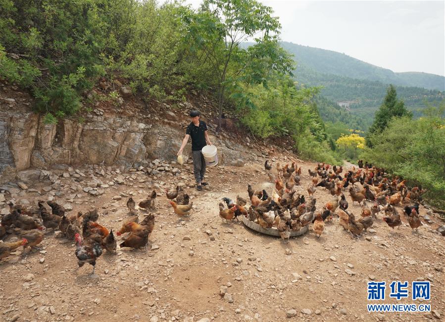 6月4日,唐山市豐潤區(qū)火石營鎮(zhèn)趙莊子村百草坡農產品農民專業(yè)合作社社員在生態(tài)農業(yè)園給散養(yǎng)雞喂食。新華社記者郭雅茹攝。