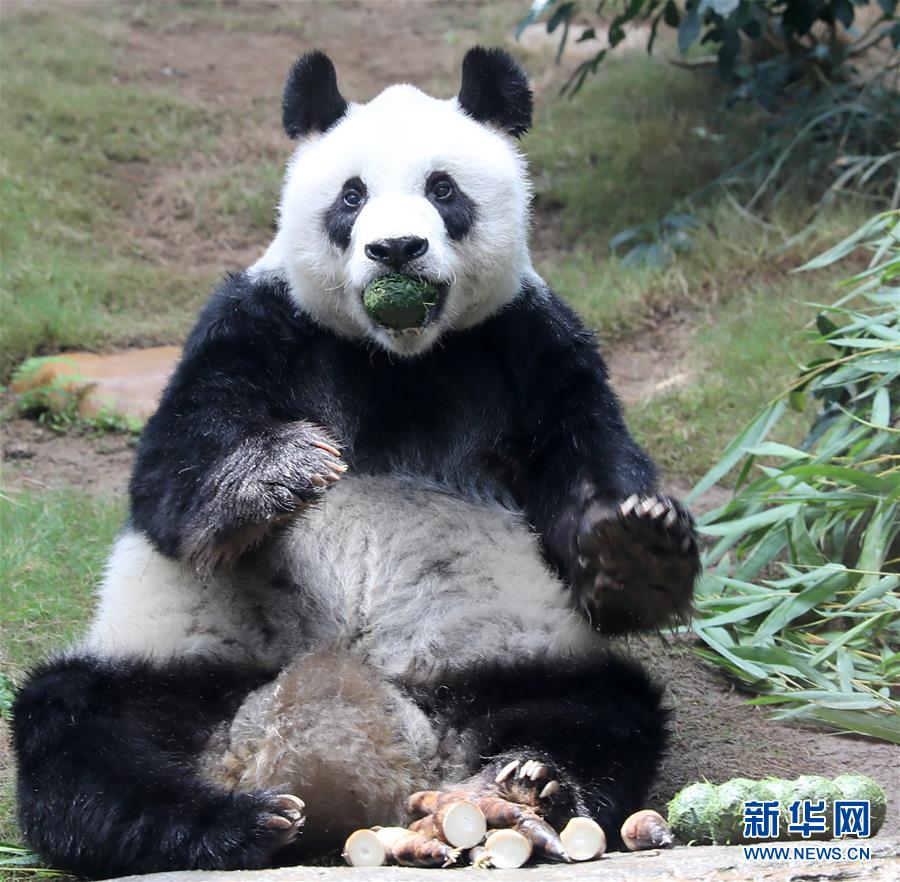 在香港海洋公園,大熊貓“安安”坐在小山坡上吃竹葉團(5月11日攝)。新華社記者吳曉初攝