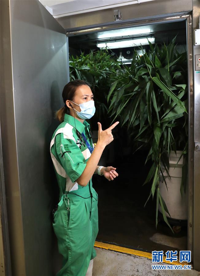 香港海洋公園陸生動(dòng)物部監(jiān)督殷漫萍介紹熊貓食物竹子的儲(chǔ)存(5月11日攝)。新華社記者吳曉初攝