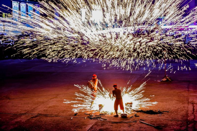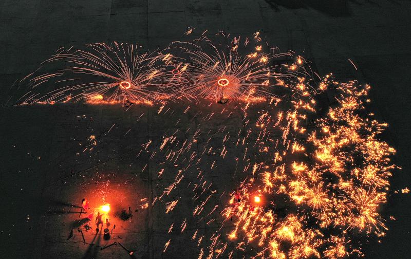 2020年6月7日晚8時許,吉林長春青岡立交橋附近,神韻打鐵花表演隊改進了傳統(tǒng)單一的擊打鐵花的形式,增添了空中轉(zhuǎn)花、高空散花、鋪地印花等多種花型。一柱鐵花沖天,在空中盤旋,朵朵銀花綻放給觀眾帶來了震撼的視覺享受。
