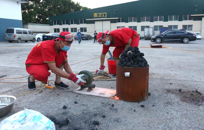 2020年6月7日晚8時許,吉林長春青岡立交橋附近,演出前,準(zhǔn)備一座熔化鐵汁的熔爐,用大風(fēng)匣鼓風(fēng),把事先準(zhǔn)備好的生鐵化成鐵汁待用。打鐵花用的鐵水需要加熱到1700℃,即看到鐵水迸出金花才行。打鐵花雖然好看,但表演卻極具危險性,隊員經(jīng)常被燙傷。表演隊隊長朱震介紹說。
