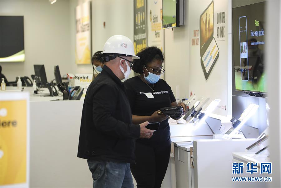 6月8日,店員(右)在美國(guó)紐約一家電信運(yùn)營(yíng)商營(yíng)業(yè)廳內(nèi)為顧客服務(wù)。在因新冠疫情進(jìn)入“居家令”近三個(gè)月之后,美國(guó)紐約市于當(dāng)?shù)貢r(shí)間8日開(kāi)始“解封”,進(jìn)入經(jīng)濟(jì)重啟的第一階段。新華社記者王迎攝