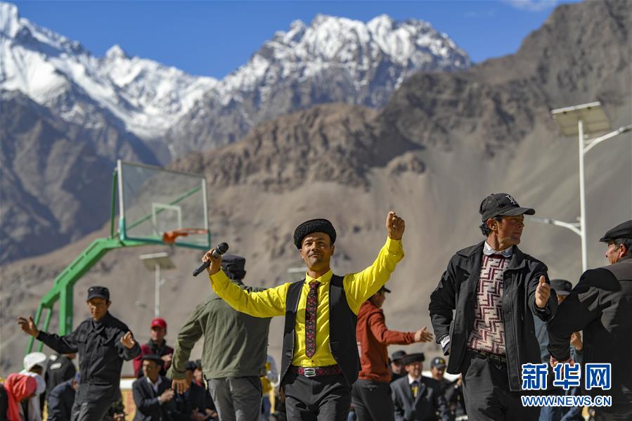 在熱斯喀木村,新疆塔什庫爾干塔吉克自治縣文工團(tuán)演員阿布都熱蘇力·曼蘇爾汗(身著黃色襯衣者)為村民演唱民歌《我愛你,祖國》(6月6日攝)。新華社記者胡虎虎攝