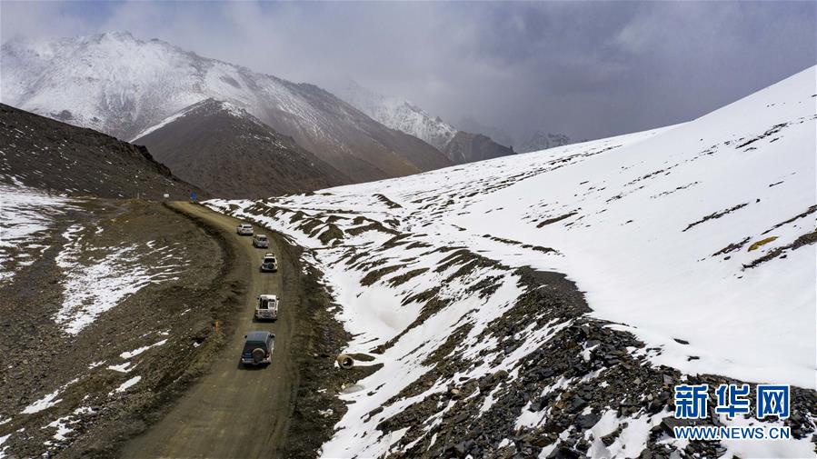 新疆塔什庫爾干塔吉克自治縣文工團(tuán)演員開車翻越雪山達(dá)坂,前往達(dá)布達(dá)爾鄉(xiāng)熱斯喀木村演出(6月5日攝,無人機(jī)照片)。新華社記者胡虎虎攝