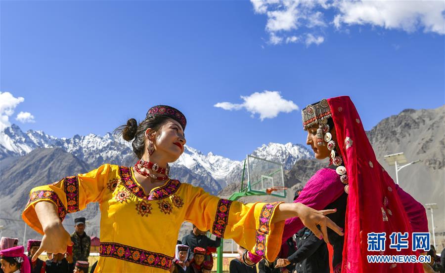 在熱斯喀木村,新疆塔什庫爾干塔吉克自治縣文工團(tuán)演員(左)與村民一起跳舞(6月6日攝)。新華社記者胡虎虎攝