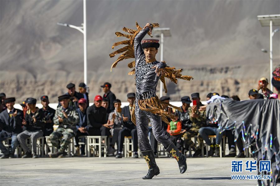 在熱斯喀木村,新疆塔什庫爾干塔吉克自治縣文工團(tuán)演員為村民表演國家級(jí)非物質(zhì)文化遺產(chǎn)——塔吉克族鷹舞(6月6日攝)。新華社記者胡虎虎攝