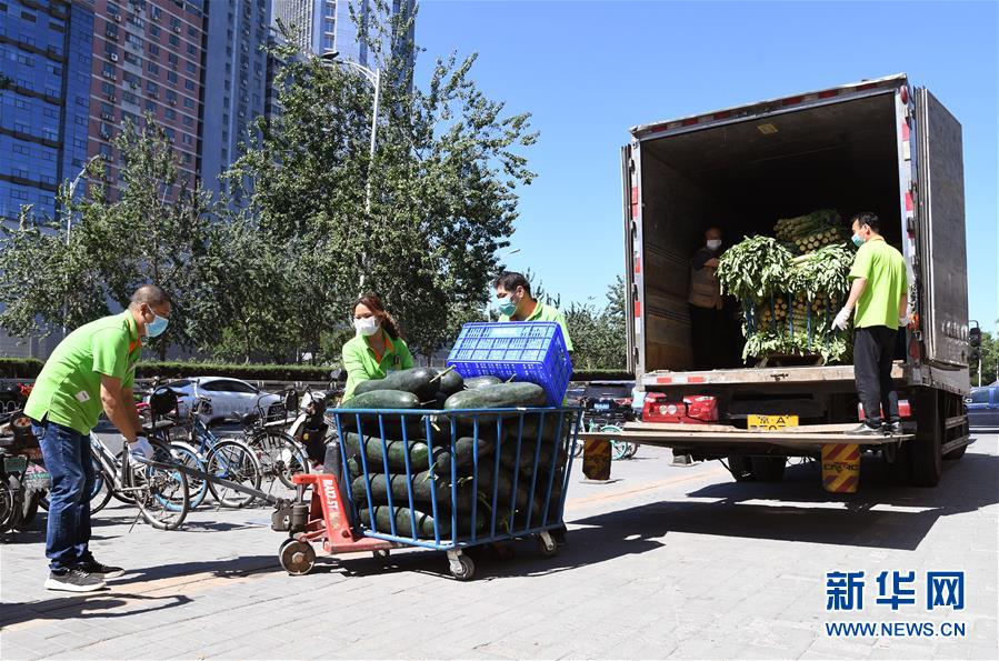 6月14日,在北京市海淀區(qū)的超市發(fā)雙榆樹(shù)店門口,工作人員在搬運(yùn)蔬菜。  新華社記者 任超 攝