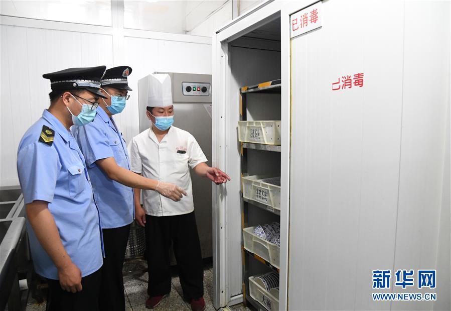 6月17日,在位于北京市海淀區(qū)的海碗居增光路店,執(zhí)法人員對(duì)店內(nèi)碗筷的消毒情況進(jìn)行檢查。新華社記者 任超 攝