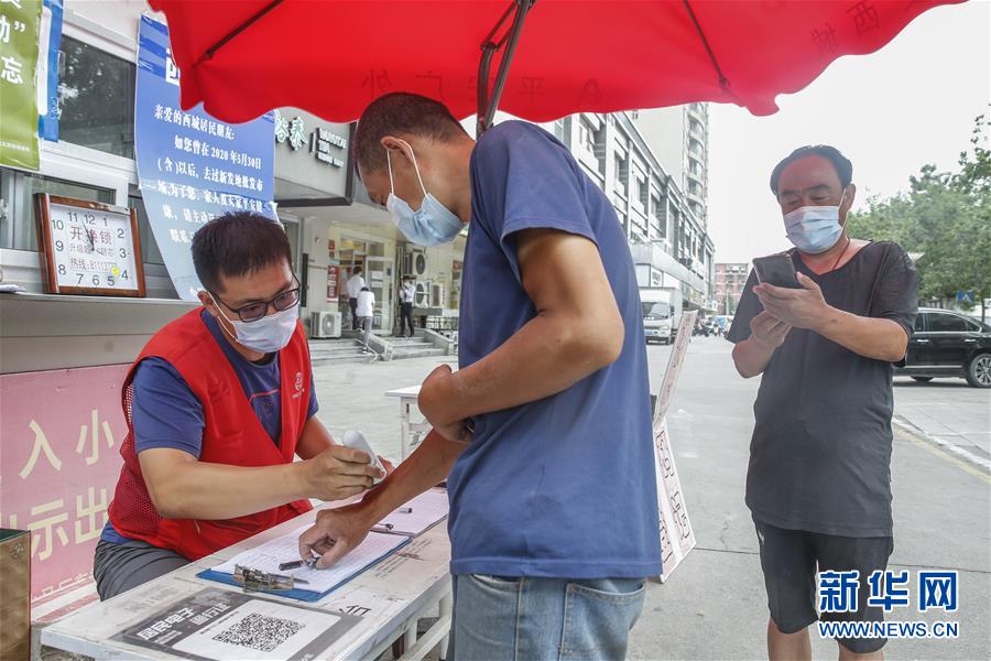 6月17日,人們?cè)诒本┦形鞒菂^(qū)廣外街道小馬廠東社區(qū)的入口登記信息。新華社記者 張玉薇 攝