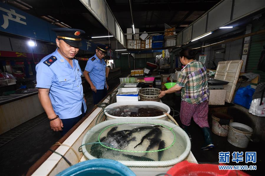 6月17日,市場監(jiān)管執(zhí)法人員在東林鎮(zhèn)農(nóng)貿(mào)市場開展專項(xiàng)執(zhí)法行動(dòng),檢查是否存在非法銷售野生動(dòng)物的情況。