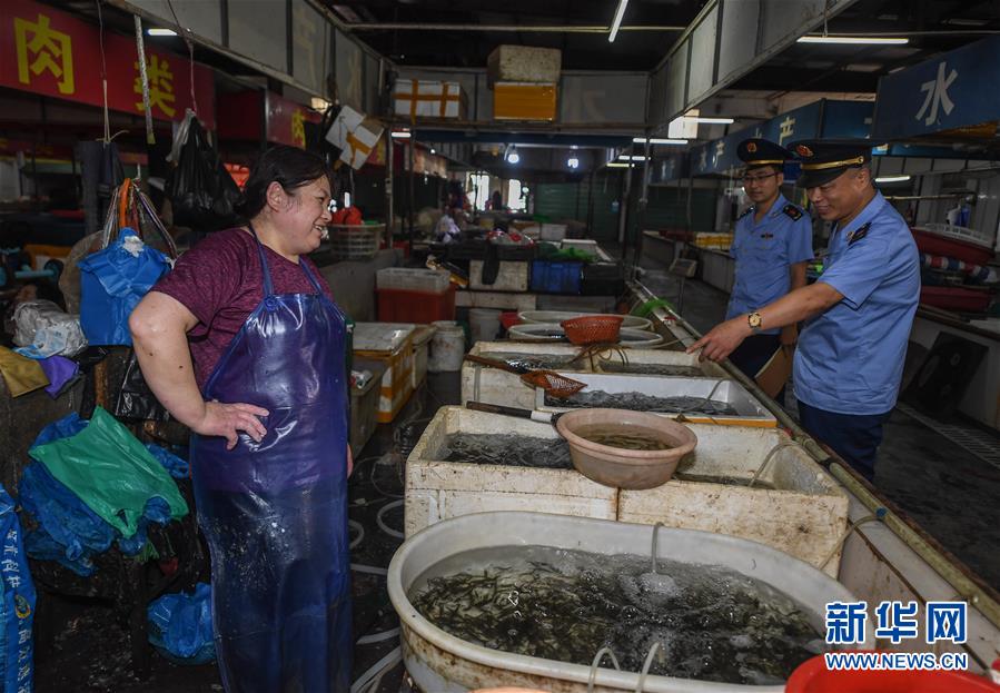 6月17日,市場(chǎng)監(jiān)管執(zhí)法人員在東林鎮(zhèn)農(nóng)貿(mào)市場(chǎng)開(kāi)展專(zhuān)項(xiàng)執(zhí)法行動(dòng),檢查是否存在非法銷(xiāo)售野生動(dòng)物的情況。新華社記者 徐昱 攝