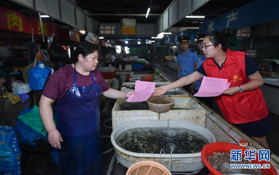 6月17日,黨員志愿者(右一)在東林鎮(zhèn)農(nóng)貿(mào)市場(chǎng)給經(jīng)營(yíng)戶(hù)發(fā)放野生動(dòng)物保護(hù)及禁食倡議書(shū)。新華社記者 徐昱 攝