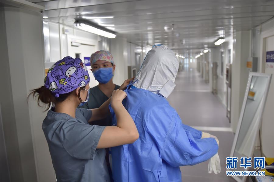 6月19日,在北京地壇醫(yī)院隔離病房外,護士在穿防護服。新華社記者彭子洋攝
