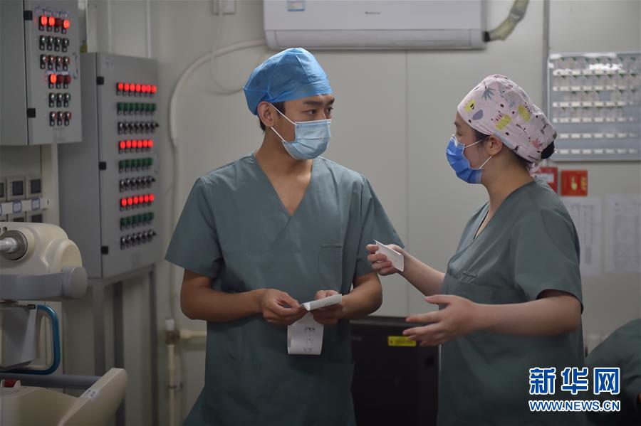 6月19日,在北京地壇醫(yī)院隔離病區(qū),一名來地壇醫(yī)院支援的護士(左)在跟地壇醫(yī)院的護士學(xué)習(xí)使用對講機。新華社記者彭子洋攝