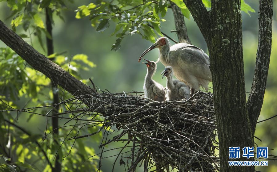 在陜西省漢中市洋縣四郎鎮(zhèn)田嶺村的一片密林里,朱鹮在巢里照看幼鳥(2018年6月2日攝)。記者22日從陜西省林業(yè)局了解到,據(jù)不完全統(tǒng)計,曾幾近滅絕的朱鹮,其全球種群數(shù)量已超過5000只,其中中國境內(nèi)4400只,棲息地呈現(xiàn)出以秦嶺為中心向東亞歷史分布地擴展的趨勢。新華社記者陶明攝