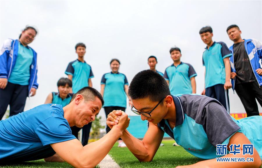 6月22日,河北省邯鄲市邯山區(qū)第一中學(xué)的高三學(xué)生和老師進(jìn)行“掰手腕”游戲。2020年高考臨近,河北省邯鄲市邯山區(qū)第一中學(xué)在積極做好高三學(xué)生復(fù)習(xí)備考的同時(shí),開展多種形式的減壓活動(dòng),幫助學(xué)生釋放緊張情緒。新華社記者王曉攝