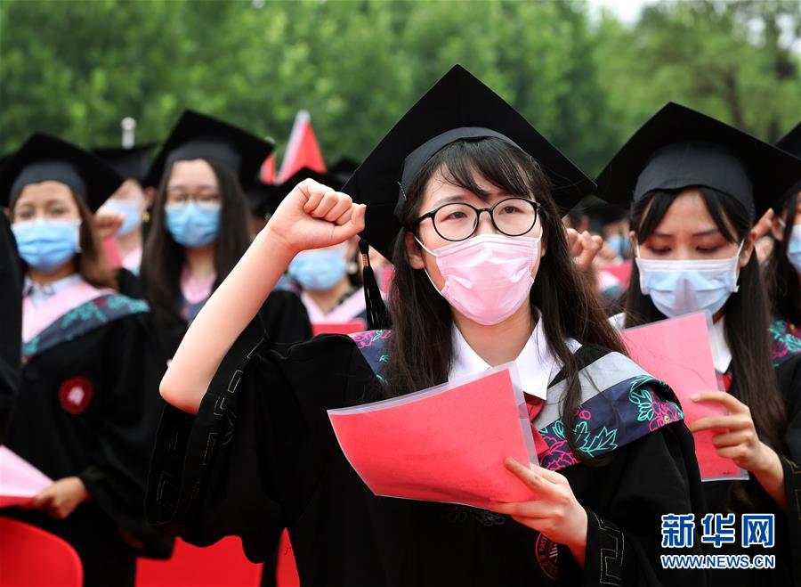 6月23日,在華東師范大學(xué)閔行校區(qū)的畢業(yè)典禮上,師范專業(yè)的畢業(yè)生舉行宣誓儀式。當(dāng)日,華東師范大學(xué)舉行2020屆畢業(yè)典禮。由于疫情防控需要,今年的典禮在兩個校區(qū)分別舉辦,并全程在線直播。約7700名華東師范大學(xué)2020屆畢業(yè)生通過現(xiàn)場或“云端”的方式參加畢業(yè)典禮。新華社記者劉穎攝