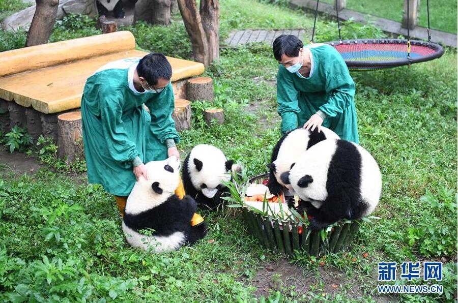 當(dāng)日,重慶動(dòng)物園為4只大熊貓“雙雙”“重重”“喜喜”“慶慶”舉行周歲生日慶?;顒?dòng)。4只大熊貓?jiān)谥貞c動(dòng)物園熊貓館運(yùn)動(dòng)場(chǎng)內(nèi)玩耍嬉戲,享用市民游客為它們親手制作的“生日蛋糕”。
