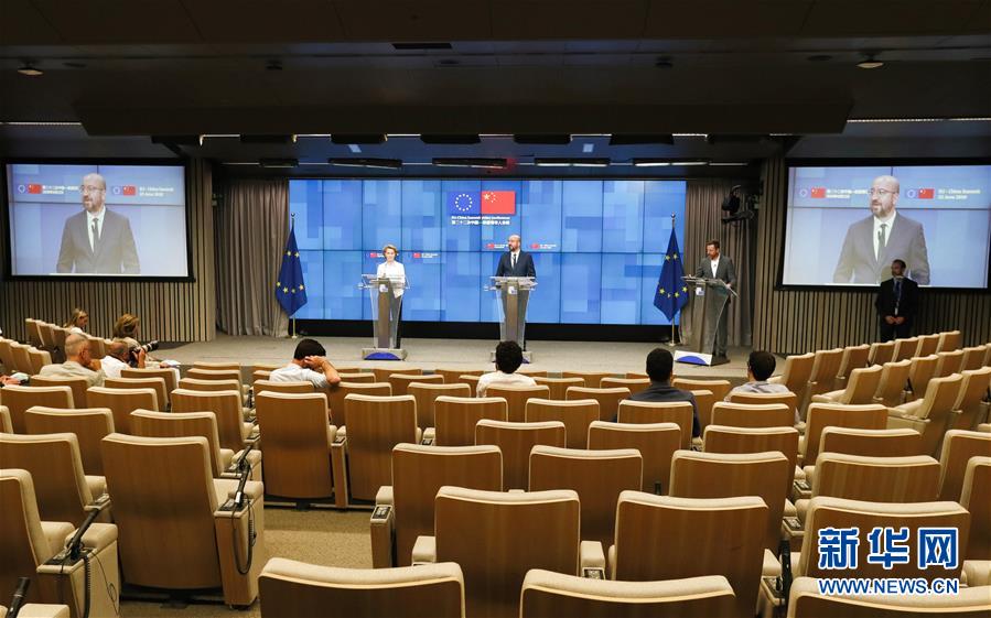 6月22日,歐洲理事會主席米歇爾(中右)和歐盟委員會主席馮德萊恩(中左)在位于比利時(shí)布魯塞爾的歐盟總部出席第二十二次中國-歐盟領(lǐng)導(dǎo)人會晤后舉行的新聞發(fā)布會。新華社記者鄭煥松攝