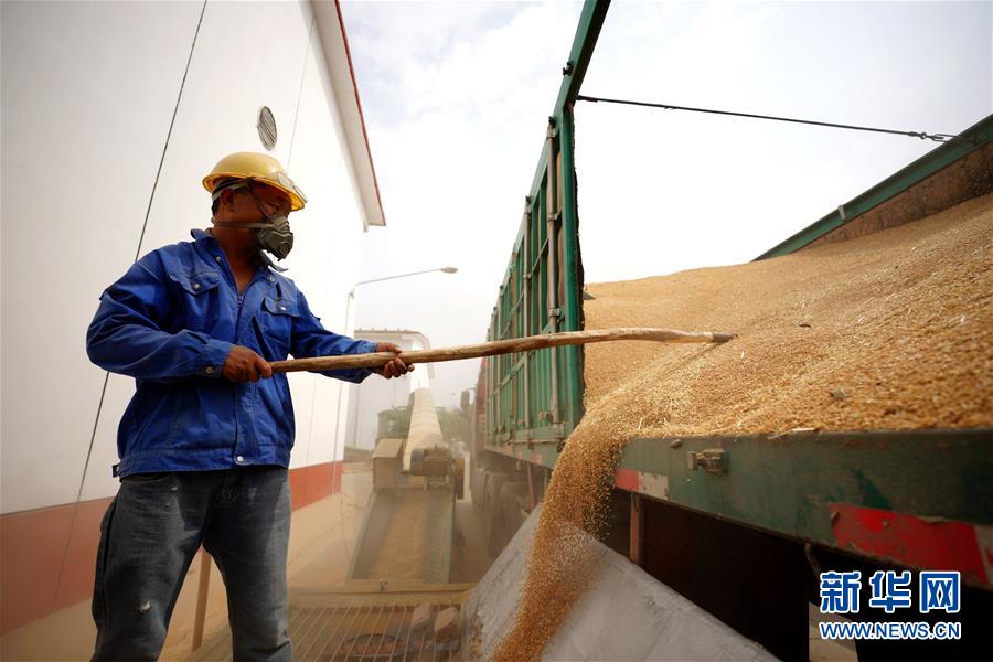 6月23日,在河北柏鄉(xiāng)國家糧食儲備庫,工作人員將小麥入庫。麥?zhǔn)者^后,河北柏鄉(xiāng)國家糧食儲備庫積極騰倉納糧,做好夏糧收儲入庫工作,確保農(nóng)民順利賣糧。新華社記者王曉攝