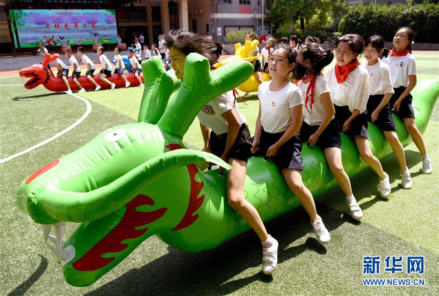 6月24日,西安市新城區(qū)后宰門小學(xué)的學(xué)生在進(jìn)行旱地龍舟比賽。端午節(jié)臨近,各地舉行包粽子、做香包、賽龍舟等豐富多彩的民俗文化活動(dòng),迎接傳統(tǒng)佳節(jié)的到來(lái)。新華社記者劉瀟攝