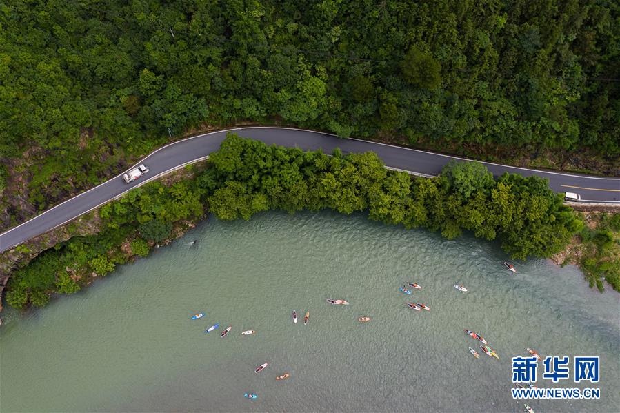 水上運動愛好者在杭州市富陽區(qū)湖源鄉(xiāng)的壺源溪上體驗槳板運動的樂趣(6月28日攝,無人機照片)。近期,浙江省杭州市富陽區(qū)場口鎮(zhèn)、常安鎮(zhèn)和湖源鄉(xiāng)組團開啟了一場夏季“綠水青山嘉年華”。這幾個壺源溪流域鄉(xiāng)鎮(zhèn)整合生態(tài)旅游資源,組團開發(fā)山村旅游項目,游客可以參與壺源溪水上游樂、露營永安山頂、特色農產品集市和瓜果節(jié)等特色活動。新華社記者徐昱攝