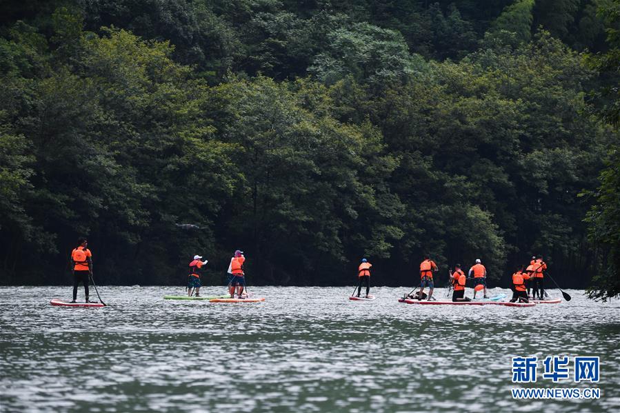 6月28日,水上運動愛好者在杭州市富陽區(qū)湖源鄉(xiāng)的壺源溪上體驗槳板運動的樂趣。近期,浙江省杭州市富陽區(qū)場口鎮(zhèn)、常安鎮(zhèn)和湖源鄉(xiāng)組團開啟了一場夏季“綠水青山嘉年華”。這幾個壺源溪流域鄉(xiāng)鎮(zhèn)整合生態(tài)旅游資源,組團開發(fā)山村旅游項目,游客可以參與壺源溪水上游樂、露營永安山頂、特色農產品集市和瓜果節(jié)等特色活動。新華社記者徐昱攝