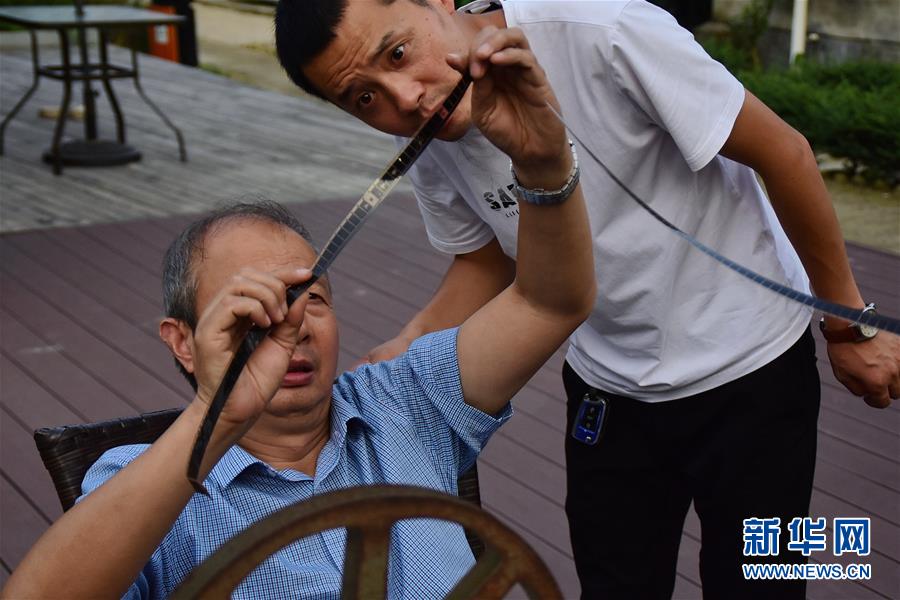 6月30日,朱生榮(左)和兒子朱強(qiáng)(右)在當(dāng)晚電影開播前檢查膠片位置。新華社記者鄭夢雨攝