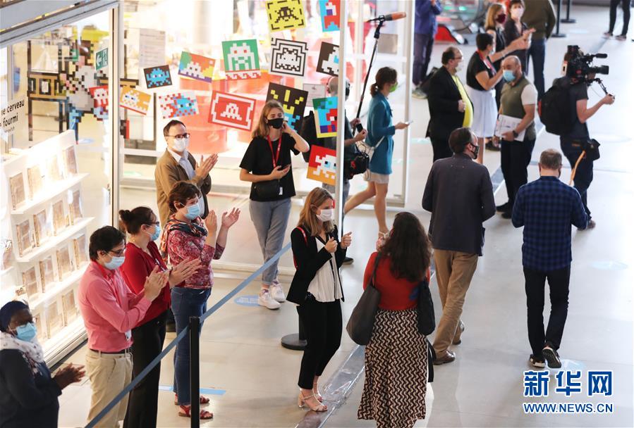 7月1日,法國巴黎蓬皮杜藝術(shù)中心的工作人員鼓掌歡迎參觀者。因新冠疫情關(guān)閉的法國巴黎蓬皮杜藝術(shù)中心于7月1日重新開門迎客。目前,中心只開放6層的臨時展區(qū)和4、5層的現(xiàn)代藝術(shù)常設(shè)展區(qū)。參觀者需提前網(wǎng)上預(yù)約參觀時段,11歲以上參觀者須佩戴口罩,參觀過程中保持安全距離。新華社記者高靜攝