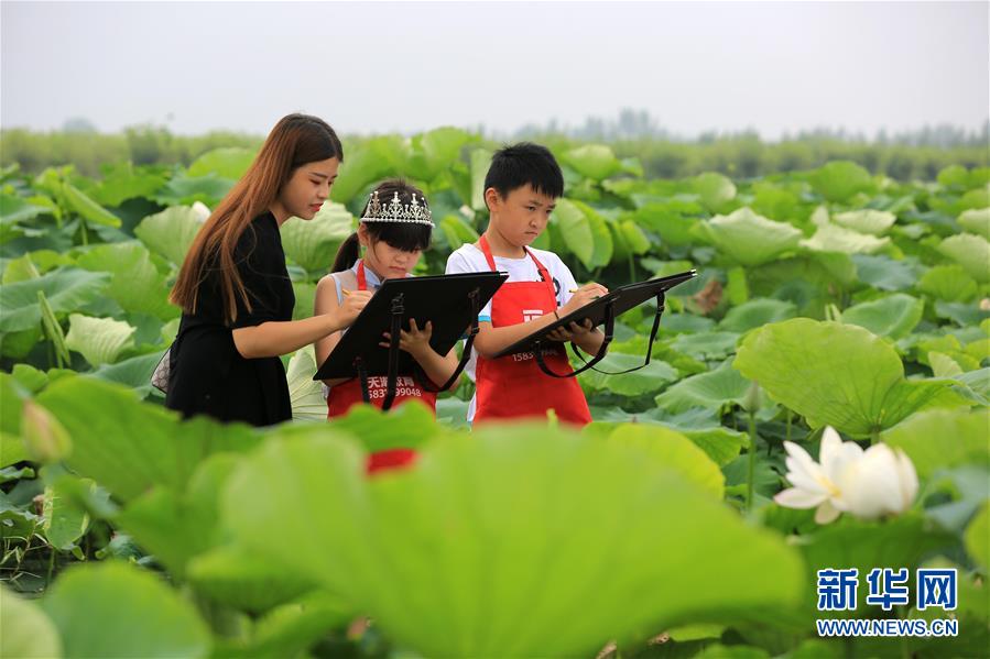 7月3日,游客在曲周縣勝豐蓮藕種植專業(yè)合作社荷塘景區(qū)寫生。時值夏日,河北省曲周縣勝豐蓮藕種植專業(yè)合作社荷塘景區(qū)的荷花競相綻放,吸引眾多游人前來觀光游覽。新華社記者 王曉 攝