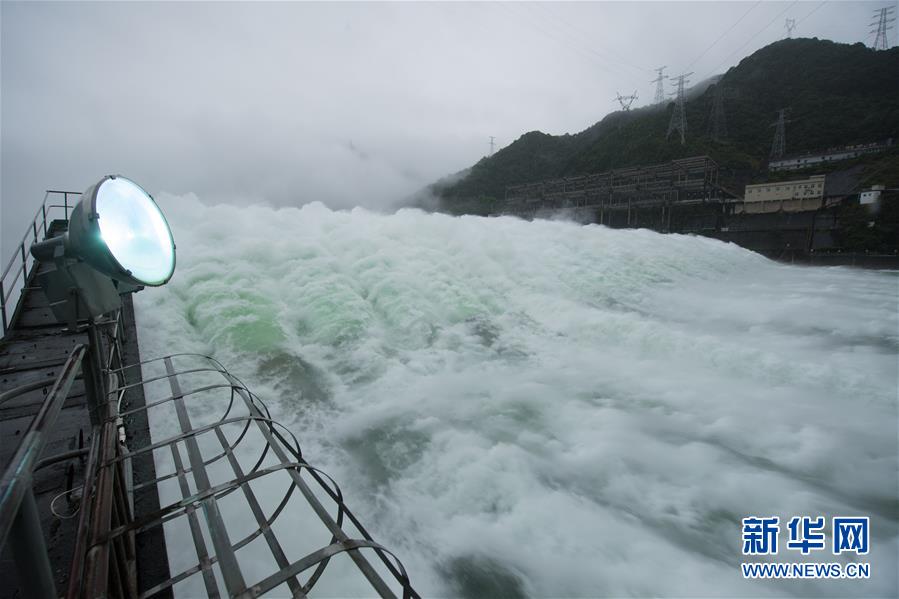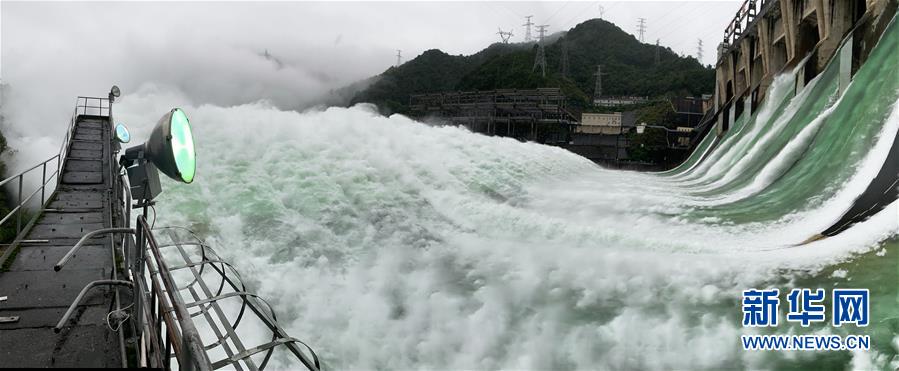 7月7日下午開啟7孔泄洪的新安江水庫(手機全景模式拍攝)。受持續(xù)降水影響,浙江新安江水庫水位持續(xù)快速上升。繼當日10時開啟3孔、12時開啟5孔泄洪后,新安江水庫于16時增加到7孔泄洪。新安江水庫是華東地區(qū)最大的水庫,在錢塘江流域的防洪度汛中起到關(guān)鍵作用。新華社記者翁忻旸攝
