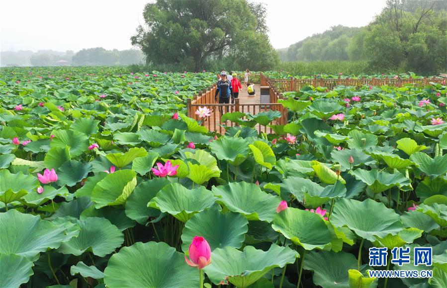 7月7日,游客在唐山市南湖公園欣賞盛開的荷花。近日,河北省唐山市南湖公園內(nèi)荷花競相綻放,呈現(xiàn)出“接天蓮葉無窮碧,映日荷花別樣紅”的美麗景象,吸引了眾多游客前來觀賞。新華社記者楊世堯攝